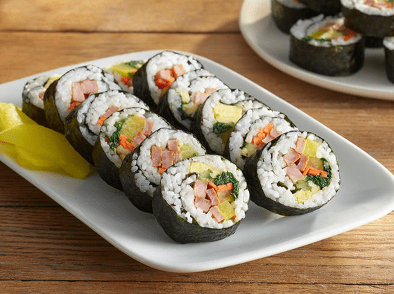 You may think this is sushi but that would make you wrong. Kimbap is a korean dish where rice is wrapped in seaweed. But, it comes with a variety of fillings: Spam, beef, egg, and spinach just to name a few. This food is great for eating on the go or for a lovely picnic.